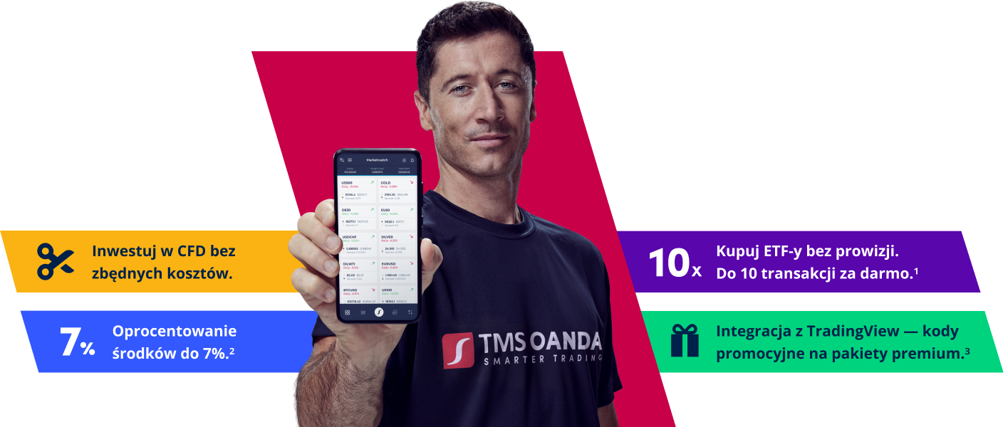 Konto OANDA TMS umożliwia trading za pośrednictwem aplikacji mobilnej z całym spektrum narzędzi do inwestowania i dostępem do globalnych rynków. Oferujemy klientom także dostęp do najnowszej wersji MetaTrader - MT5, a także integrację z platformą TradingView.