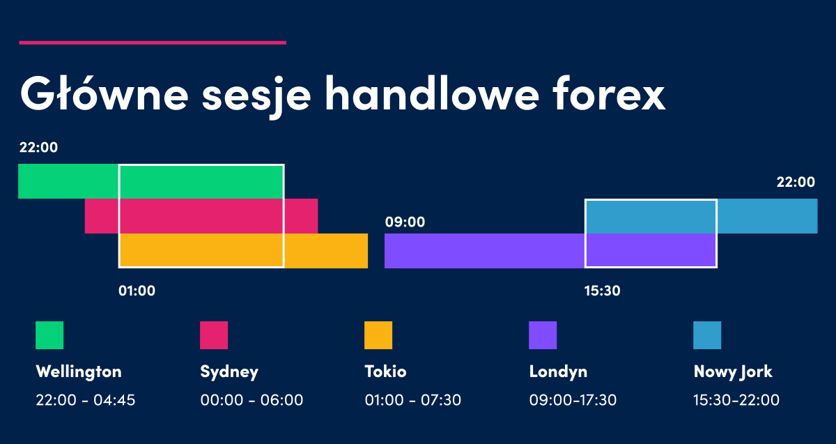 Pierwsza sesja giełdowa odbywa się w Wellington (Nowa Zelandia), która rozpoczyna się w niedzielę o 22:00 czasu polskiego. Dwie godziny później sesję rozpoczyna Australia. Następnie swoją sesję rozpoczyna Japonia. Godziny nakładania się giełd w Nowej Zelandii, Australii oraz Japonii charakteryzują się zwiększoną zmiennością walut tych krajów, co jest widoczne na takich instrumentach jak NZD/JPY, AUD,JPY, czy AUD/NZD. Sesja w Londynie, znana z wysokiej płynności, zaczyna się o 09:00 CET. Sesja w Nowym Jorku, otwiera się o 15:30 CET, nakładając się na sesję londyńską, co wywołuje znaczną zmienność i aktywność rynkową.