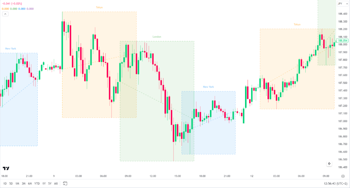 Poniższy wykres przedstawia przykładowy kurs GBP/JPY oraz zmiany zachodzące podczas różnych sesji giełdowych.