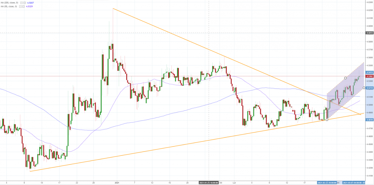 Na wykresie EUR/PLN widoczne jest wybicie górą z klina, którego górne ograniczenie stało się pierwszym istotnym wsparcie. W poniedziałek kluczowa od strony technicznej była obrona dwustu sesyjnej średniej kroczącej, która podtrzymała krótkoterminowy trend wzrostowy.