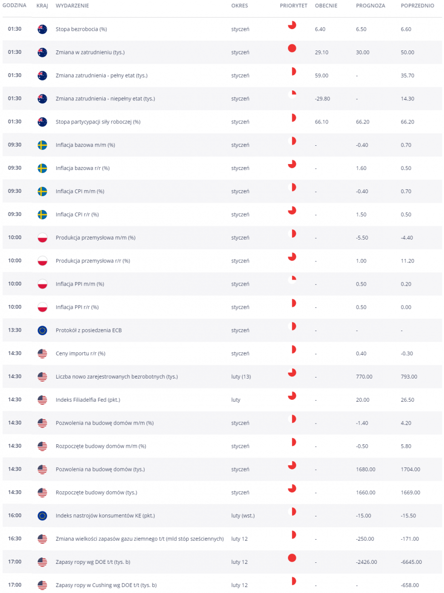 Czwartkowy kalendarz ekonomiczny jest bogaty w publikacje, jednak większość z nich ma ograniczony potencjał cenotwórczy. Za nami dane z australijskiego rynku pracy, a już o 9:30 poznamy odczyt inflacji w Szwecji. O 10:00 lokalnie istotne dane o produkcji przemysłowej. Po południu przeniesiemy się za ocean, gdzie do kluczowych publikacji należeć będą dane o liczbie nowo zarejestrowanych bezrobotnych oraz zmiana wielkości zapasów ropy naftowej wg. DOE.