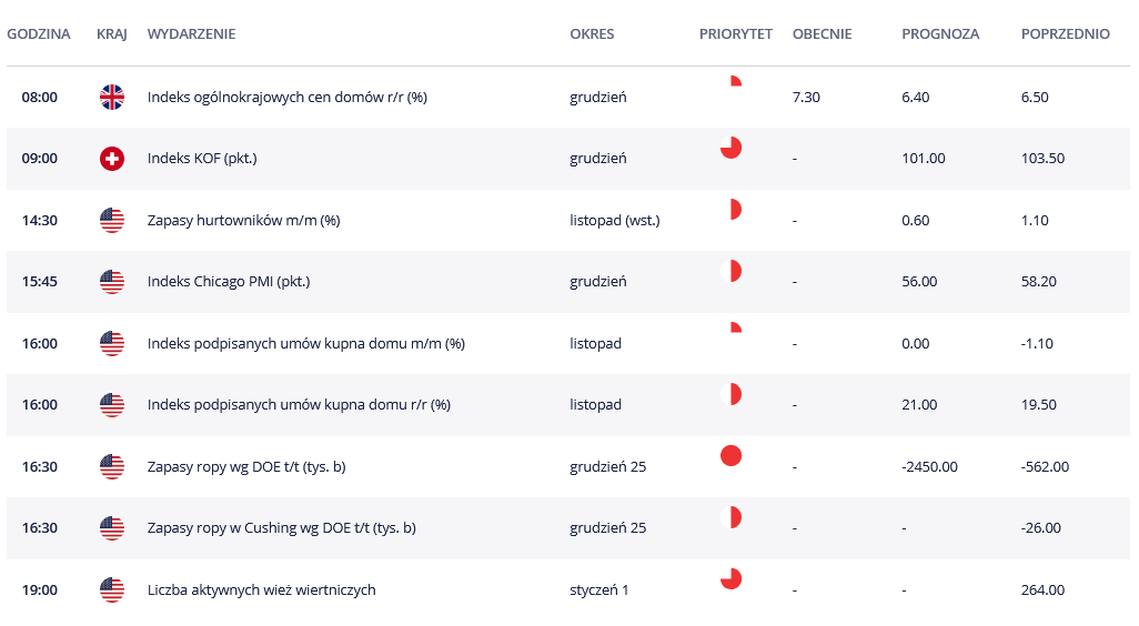 Kalendarz ekonomiczny w środę zawiera w sobie kilka ciekawych publikacji, choć w oczy rzuca się wyraźnie, że większość dotyczy USA. Jednak zanim wybierzemy się za ocean, o 9:00 poznamy indeks KOF dla szwajcarskiej gospodarki. Piętnaście minut po otwarciu Wall Street poznamy wartość indeksu Chicago PMI, a o 16:30 tygodniowy raport o zmianie wielkości zapasów ropy naftowej w amerykańskich magazynach.