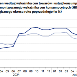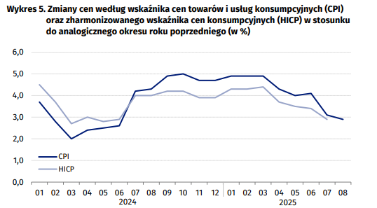 W porównaniu z lipcem 2025 r. najbardziej zauważalne wzrosty cen dotyczyły usług łączności (+1,4%), alkoholu i wyrobów tytoniowych (+0,4%) oraz restauracji i hoteli (+0,3%). Z kolei największe spadki odnotowano w przypadku odzieży i obuwia (–1,5%), transportu (–0,4%) oraz żywności (–0,1%). Warto zaznaczyć, że dane te są nieznacznie wyższe od tzw. szybkiego szacunku inflacji za sierpień 2025 r., który wynosił 2,8%. Zarówno wskaźnik CPI, jak i HICP (zharmonizowany indeks cen konsumpcyjnych), potwierdzają ogólną tendencję umiarkowanego wzrostu cen obserwowaną w 2025 roku.