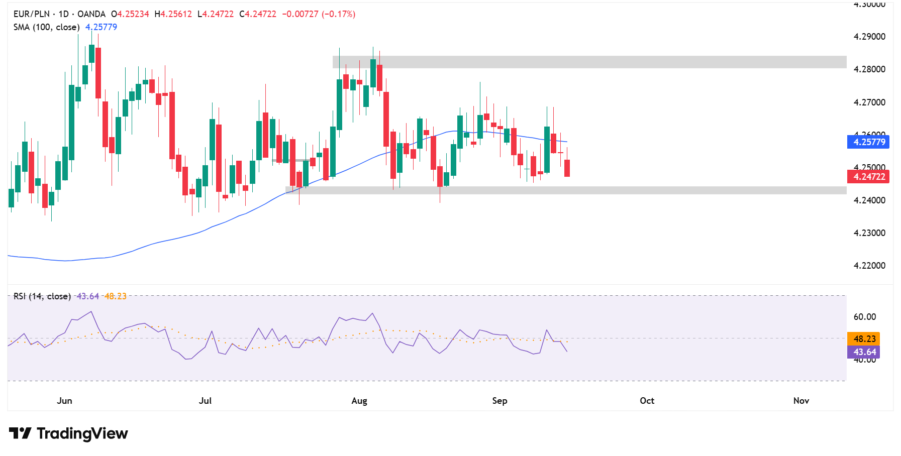 Początek tygodnia przyniósł umocnienie polskiego złotego. EURPLN traci dziś 0,15% i zbliża się w rejon wsparcia wyznaczonego przez dolne ograniczenie konsolidacji (4,2440), z której to para walutowa nie może się przełamać od końca lipca b.r..