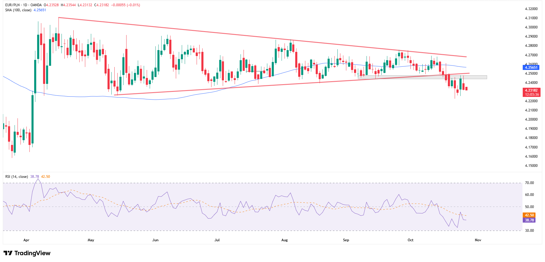 EURPLN w piątek przetestowało opór na poziomie 4,2450, po czym zeszło dzisiaj w rejon 4,2315.