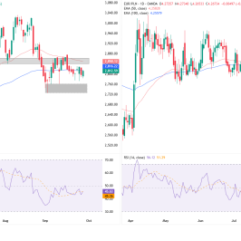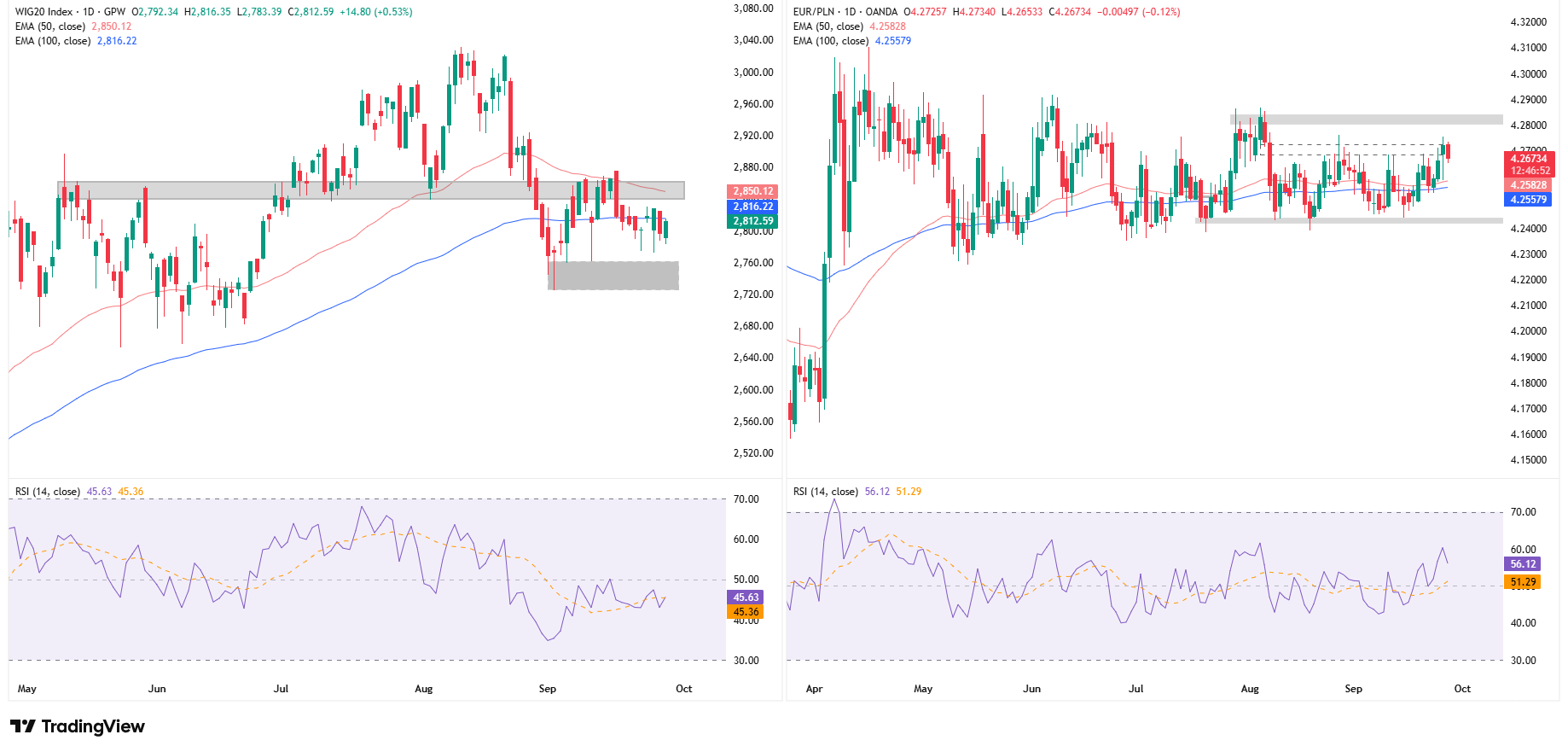 Wykres dzienny WIG20 i EURPLN, źródło: TradingView