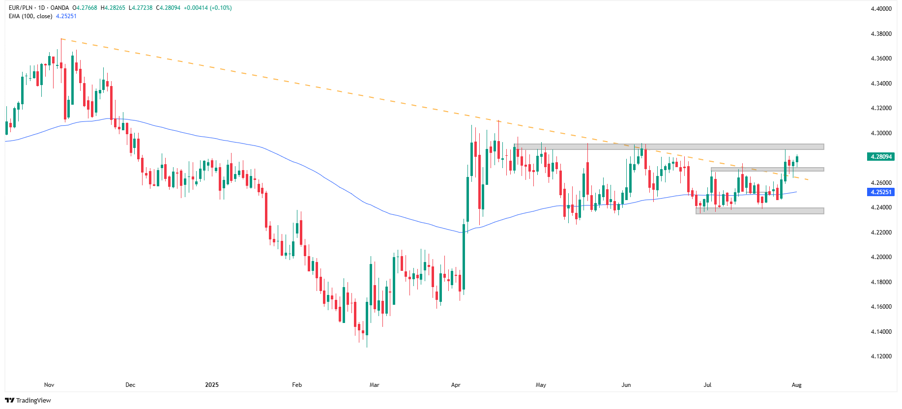 We wtorek kurs EUR/PLN przełamał linię trendu spadkowego, co może sygnalizować zmianę dotychczasowej tendencji na rynku. W środę para przetestowała tę linię od góry, co często bywa interpretowane jako klasyczne potwierdzenie wybicia. Czwartkowa sesja zakończyła się utworzeniem formacji świecowej pin bar, która – szczególnie w kontekście wcześniejszego przełamania trendu – może być odczytywana jako sygnał prowzrostowy, sugerujący potencjalne odbicie w kierunku wyższych poziomów cenowych. W najbliższym czasie kluczowym poziomem technicznym pozostaje opór w rejonie 4.29. To tam może rozegrać się walka między stroną popytową a podażową. Trwałe wybicie tego poziomu otworzyłoby drogę do dalszych wzrostów, podczas gdy jego odrzucenie mogłoby sugerować powrót do konsolidacji lub nawet ponowny test przełamanej linii trendu.
