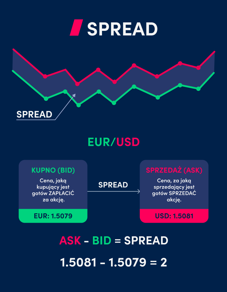 - Spread - to różnica między ceną kupna (Ask) a ceną sprzedaży (Bid) danej pary walutowej. Jest to podstawowy koszt transakcyjny i zysk brokera. Im niższy spread, tym lepiej dla inwestora.