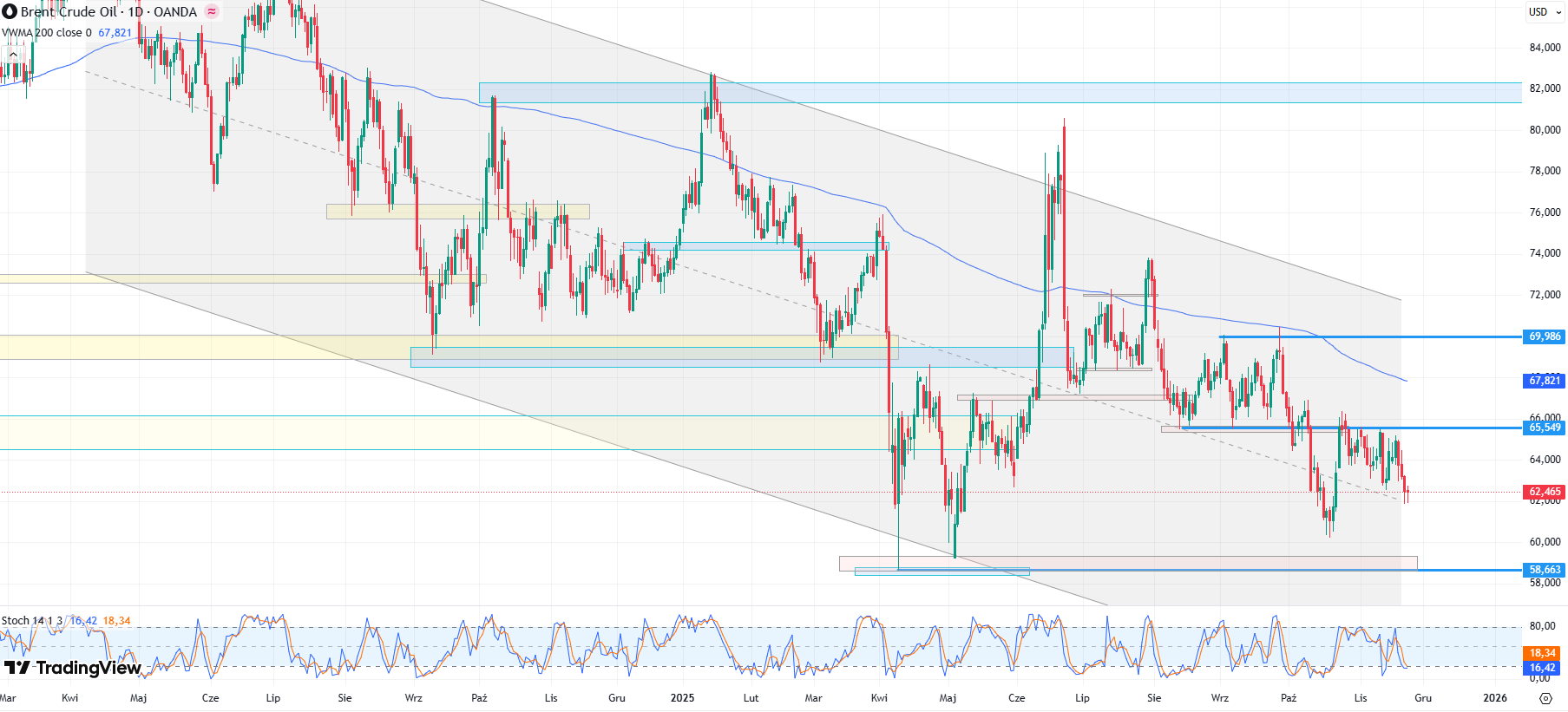 W rezultacie coraz liczniejsze doniesienia o spadku rosyjskich wysyłek ropy i diesla mogą działać wspierająco na ceny ropy, mimo że w średnim horyzoncie rynek wciąż obawia się nadpodaży, która powinna tworzyć presję na dalsze spadki notowań. Potencjalnym czynnikiem stabilizującym ceny mogą być natomiast odnawiające się nadzieje na zakończenie wojny w Ukrainie, po tym jak administracja USA przedstawiła własny zarys możliwego rozwiązania konfliktu.