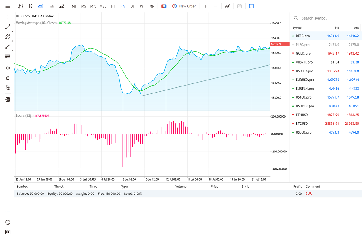 Interfejs prawie identyczny jak na MT4 z dodanymi nowymi ułatwiającymi trading i analizę funkcjonalnościami |