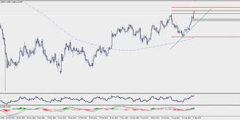 USD/CAD poważnie naruszył średnioterminową linię trendu wzrostowego, co może być pierwszym sygnałem świadczącym o zmianie trendu. Mimo wszystko warto poczekać na silniejszą aktywację strony podażowej, aby zanegować prawdopodobieństwo fałszywego wybicia. Wyraźne wybicie wyznaczonej linii sprowadzi notowania przynajmniej do 1,2665 (dołek z 9-10 listopada). Oporem pozostają szczyty z 17 i 21 listopada przy 1,2820.
