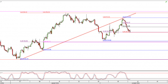 Wsparcie złożone z linii łączącej wrześniowe oraz październikowe dołki odpowiada za powstrzymanie dalszej deprecjacji australijskiego dolara. Szybkie odbicie i zmiana trendu jest obrazowana na wykresie w formie dużego cienia czterogodzinnej świecy. Kluczowy opór zlokalizowany jest blisko wczorajszego maksimum (0,7780), a wsparcie zostało ustanowione w formie dołka przy 0,7580.