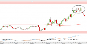 Impet wzrostowy na EUR/GBP traci siłę w pobliżu górnego ograniczenia kanału wzrostowego (0,8720). Po wyłamaniu krótkoterminowej linii wsparcia kurs nie posiada innej możliwości jak spaść do dolnego ograniczenia kanału (0,84). Potwierdzeniem słabości kupujących jest oscylator MACD wskazujący na silną dywergencję cenową.