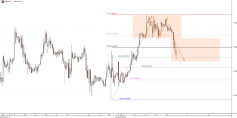Na wykresie kontraktu CFD na indeks S&P 500 doszło do wyłamania dołem z wzrostowego kanału. Bardzo możliwe, że jest to zwiastun poważniejszej spadkowej korekty. Modelowy zasięg po wybiciu z kanału zakłada zejście nawet w okolice 1830 pkt.